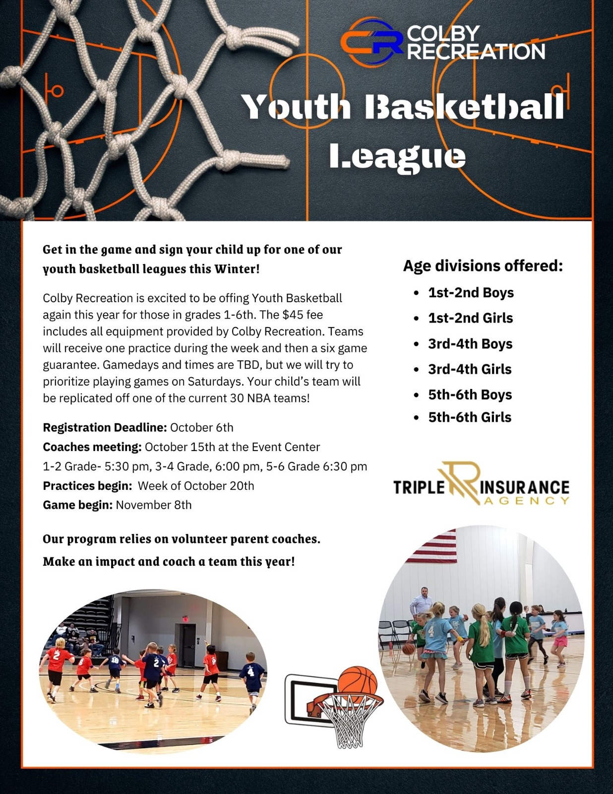 If you are wanting to coach, please mark on the registration that you are interested in coaching. There are coach request forms available at the office in the event center that will need to be filled out and turned in. You can turn this in in person at the Event Center or you can email/scan it to us (recreation@cityofcolbyks.gov). If you are wanting to coach then this form must be turned in. We will have a coach meeting on October 15 with the 1-2 grade at 5:30, the 3-4 grade at 6:00 pm, and the 5-6 grade at 6:30 pm. We will try and schedule as many games for Saturdays as we can. November and December are extremely busy in the months of November and December so we may have to get creative with some game dates. We are wanting to have the schedule finalized by the end of October to give families adequate time to make arrangements for games. With scheduling always an issue at the Event Center in the winter months we may have to utilize the High School or Grade School for some games like in years past.